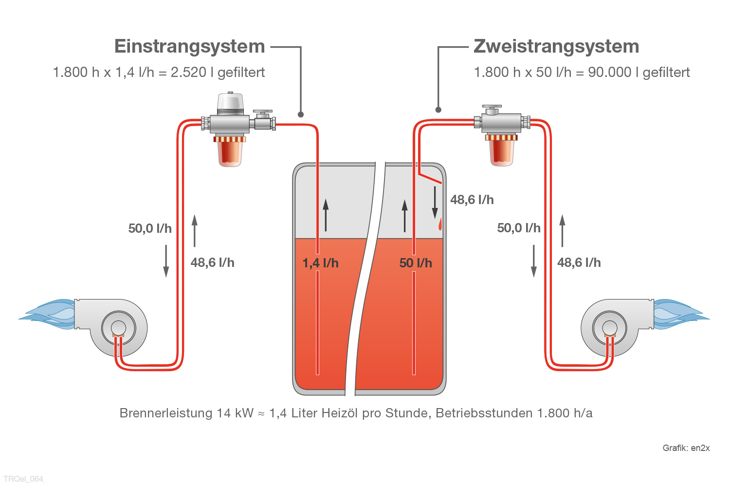 In der Grafik sind es beispielsweise 50 Liter Heizöl pro Stunde, die zum Brenner gefördert werden. Das nicht verbrannte Heizöl, in diesem Beispiel 48,6 Liter pro Stunde, läuft zurück in den Tank. Der Tankinhalt wird also ständig umgewälzt. Auf ein Jahr mit typischen 1.800 Brennerlaufstunden wird es weit über 30 Mal komplett im Kreis gepumpt. Dadurch erwärmt sich das Heizöl und wird mit Sauerstoff angereichert, wodurch es schneller altert und Sedimente bilden kann. Auch die Standzeit des Ölfilters verkürzt sich, weil er ständig viel mehr Heizöl filtern muss, als eigentlich verbrannt wird.