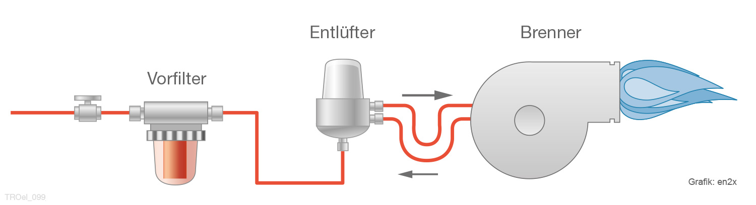 Beim Einstrangsystem verläuft vom Heizöltank bis zum Vorfilter nur eine Ölleitung. Dem Tank wird über diese Saugleitung genau so viel Heizöl entnommen wie tatsächlich am Brenner benötigt wird. Es muss kein Öl zum Tank zurückgeführt werden.