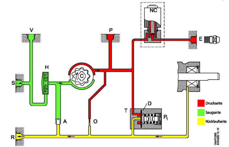 In 2-Strang Systemen wird das überschüssige Öl zum Rücklaufstutzen (R) geleitet und dann zum Tank. In 1- Strang Systemen mit verschlossenem Rücklaufstutzen (R) und einer Bypassscheibe (hufeisenförmig) auf der Schraube (A) wird das Öl intern zum Zahnradsatz zurück geführt (siehe auch Funktionsschema).