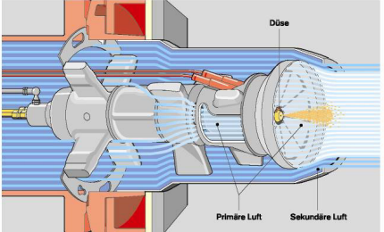 Dabei wird die Luft durch die schräg angeordneten Schlitze in eine rotierende Bewegung vor die Düse gebracht. So entsteht ein leicht entzündlicher und gut brennbarer Ölnebel.