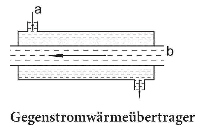 Wärmeübertrager zur Kühlung von Flüssigkeiten bestehen im einfachsten Fall aus einem Innenrohr mit Fluid a und einem dieses umhüllenden Außenrohr mit Fluid b. Sie können im Gleichstrom und im Gegenstrom betrieben werden.