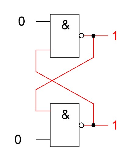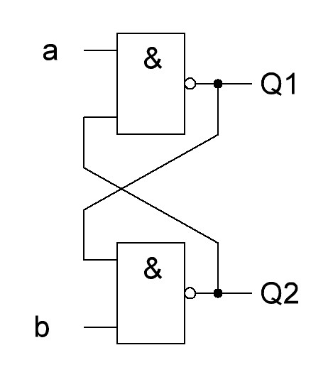 \[\begin{array}{l}{Q_1} = \overline a \cdot (b + {Q_1})\\{Q_2} = \overline b \cdot (a + {Q_2})\end{array}\]