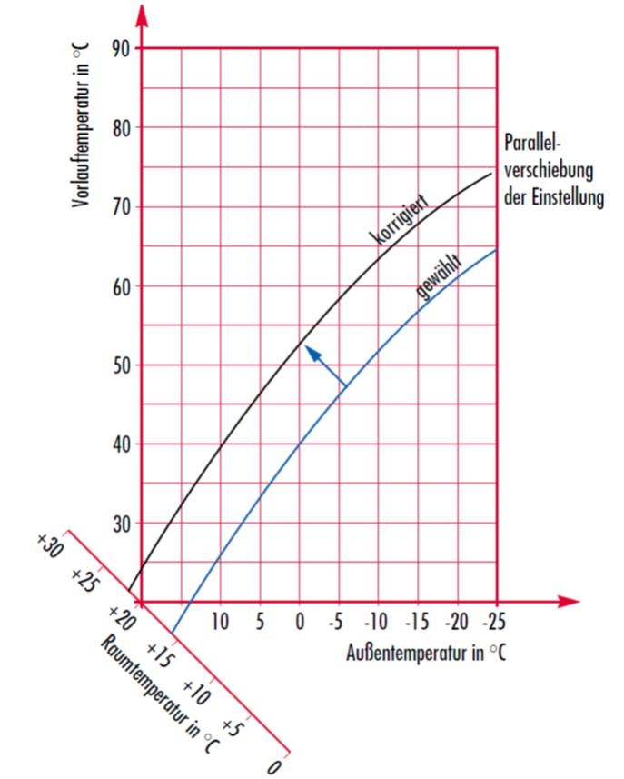 Die Heizkurve wird dadurch parallel verschoben. Der Außentemperatur wird eine höhere Vorlauftemperatur zugeordnet, und die gewünschte Raumtemperatur von 21°C wird erreicht. Eine Verstellung des Drehknopfes um einen Teilstrich entspricht einer Raumtemperaturänderung von ca. 2,5 K.