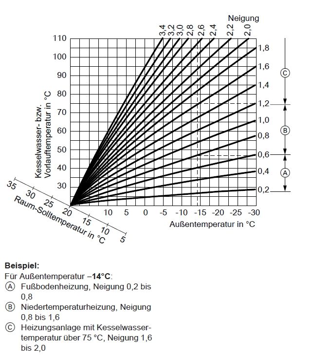 Die Neigung der Heizkurve müsste folglich auf rund 1,4 eingestellt werden, um die gewünschte Raumtemperatur von 20 Grad zu erreichen.