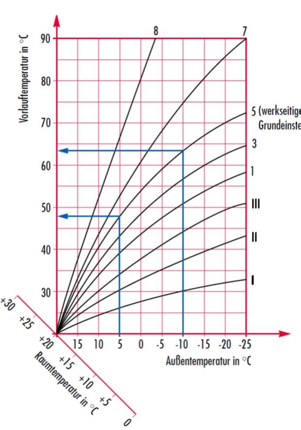 Gewählte Heizkurve 5 gewünschte Raumtemperatur 21°C tatsächliche Raumtemperatur 16°C am Tage Drehknopf (Tagpotentiometers) ist um zwei Teilstriche nach rechts zu verstelllen.