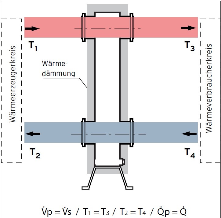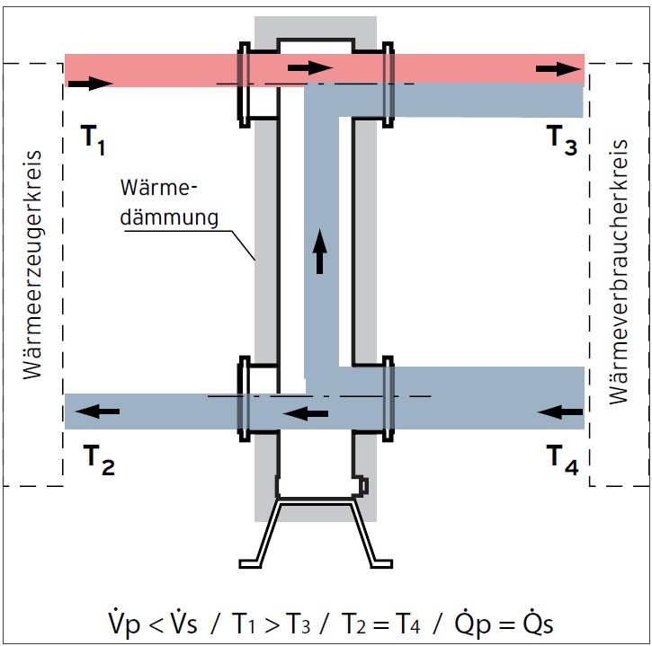 In einem Ersten sind die Massenströme im Primärkreis (zum Beispiel im Kesselkreis) und im Sekundärkreis (zum Beispiel im Fußbodenheizkreis) gleich. Das Wasser fließt dabei direkt durch das Bauteil, das dabei außer Betrieb ist.