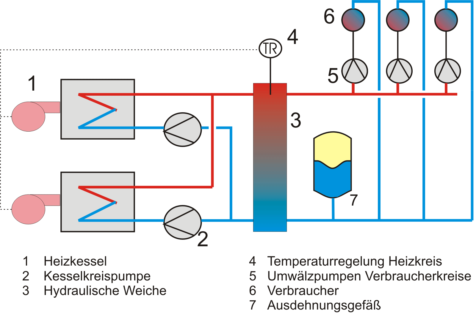 Eine hydraulische Weiche wird überwiegend in Heizungsanlagen eingesetzt, um den Heizkreis (bzw. Kreislauf Wärmeerzeuger oder Kreislauf Kälteerzeuger) und den Verbraucherkreislauf hydraulisch voneinander zu entkoppeln. Sobald im Verbraucherkreis andere Volumenströme realisiert werden müssen, als dies der Kesselkreislauf erfordert, empfiehlt es sich in den jeweiligen Kreisläufen eigene Pumpen vorzusehen. Damit diese Pumpen mit ihren unterschiedlichen Druck- und Volumenstromparametern sich nicht gegenseitig beeinflussen, ist der Einsatz einer hydraulischen Weiche notwendig.