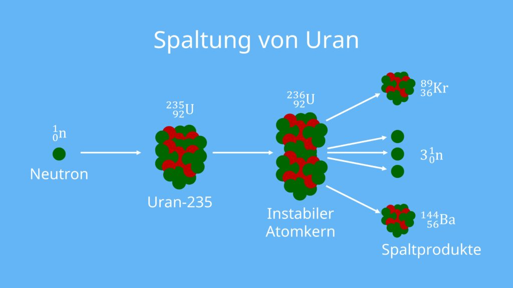 \[{}_0^1n + {}_{92}^{235}U \to {}_{92}^{236}U \to {}_{56}^{144}Ba + {}_{36}^{89}Kr + 3 \cdot {}_0^1n\]